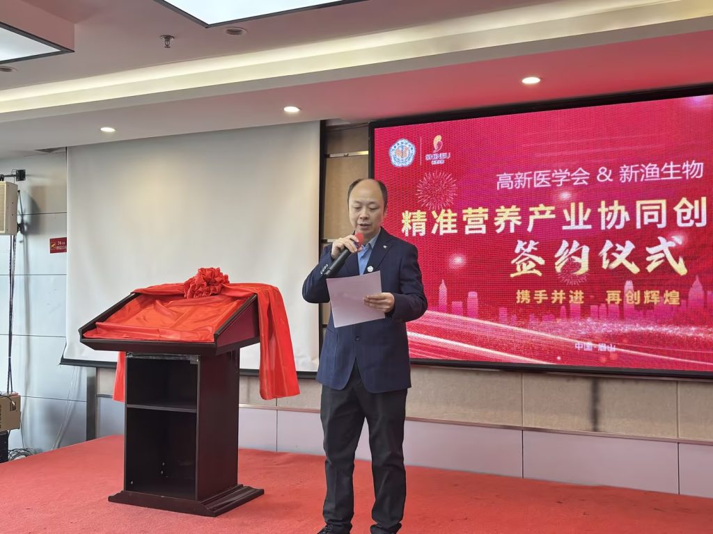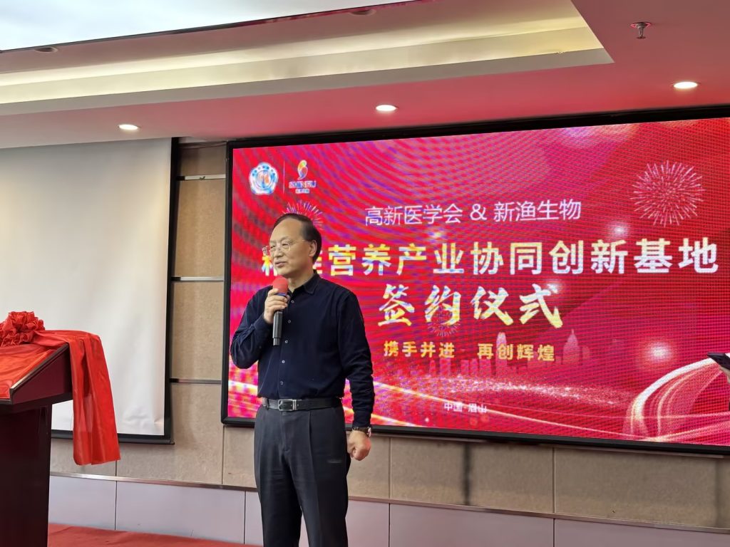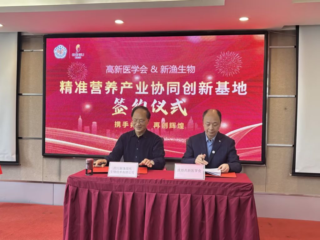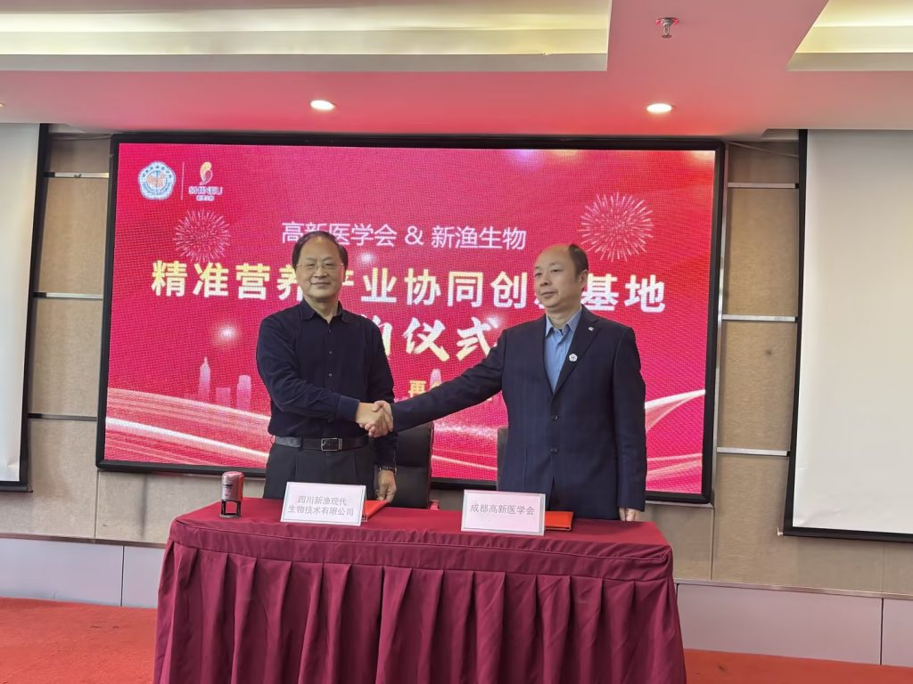 簽約儀式上,成都高新醫(yī)學(xué)會醫(yī)工融合協(xié)同創(chuàng)新中心馮懷志主任和四川新漁現(xiàn)代生物技術(shù)有限公司董事長馬建中分別致辭,表達了雙方對此次合作的高度重視和美好愿景,隨后雙方代表共同簽署了合作協(xié)議。簽約儀式結(jié)束后還舉行了成都高新醫(yī)學(xué)會精準營養(yǎng)產(chǎn)業(yè)協(xié)同創(chuàng)新基地的授牌儀式。
