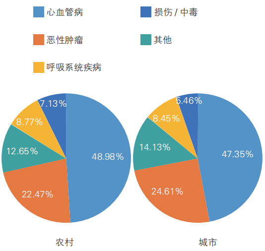 城鄉(xiāng)居民疾病死亡構成比中,心血管病占首位。2021年,心血管病分別占農村、城市死因的48.98%和47.35%(圖1)。